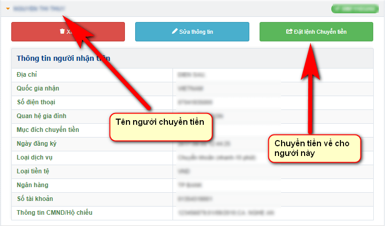 Tại website DCOM, các bạn nhấn vào trang danh sách người nhận tiền và chọn tài khoản cần chuyển