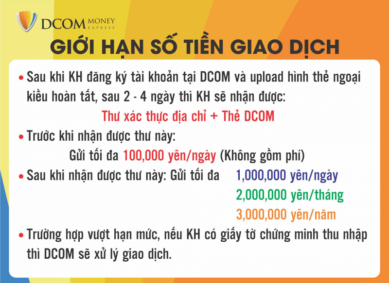 Khách hàng chỉ cần mang theo Thẻ ngoại kiều và Số tiền cần giao dịch đến DCOM là DCOM có thể Đăng ký Tài khoản & Giao dịch ngay với số tiền tối đa là 100 man/ngày nhé!!!