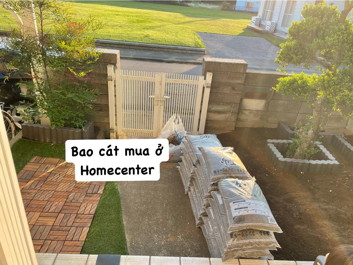 - Cát (cát sẽ giúp phẳng lớp nền trước khi trải bạt và thảm cỏ). Diện tích phần trải thảm nhà mình: 11x1.5m + 12x1.2m + 2x4m vuông là tầm 50 bao cát.