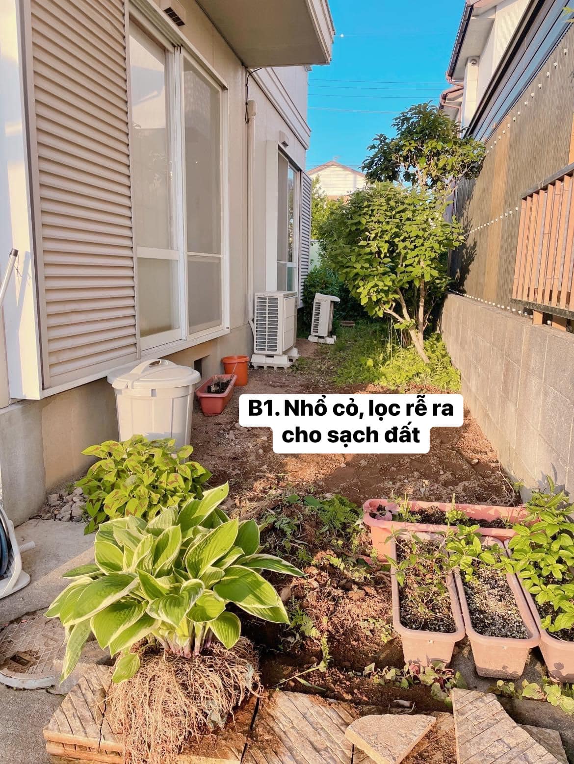 - Nhổ cỏ dại, lọc rễ lên cho sạch đất. Công đoạn này cực nhất vì nhà mình ban đầu nhiều cỏ dại, làm mấy đợt cuối tuần mới xong.