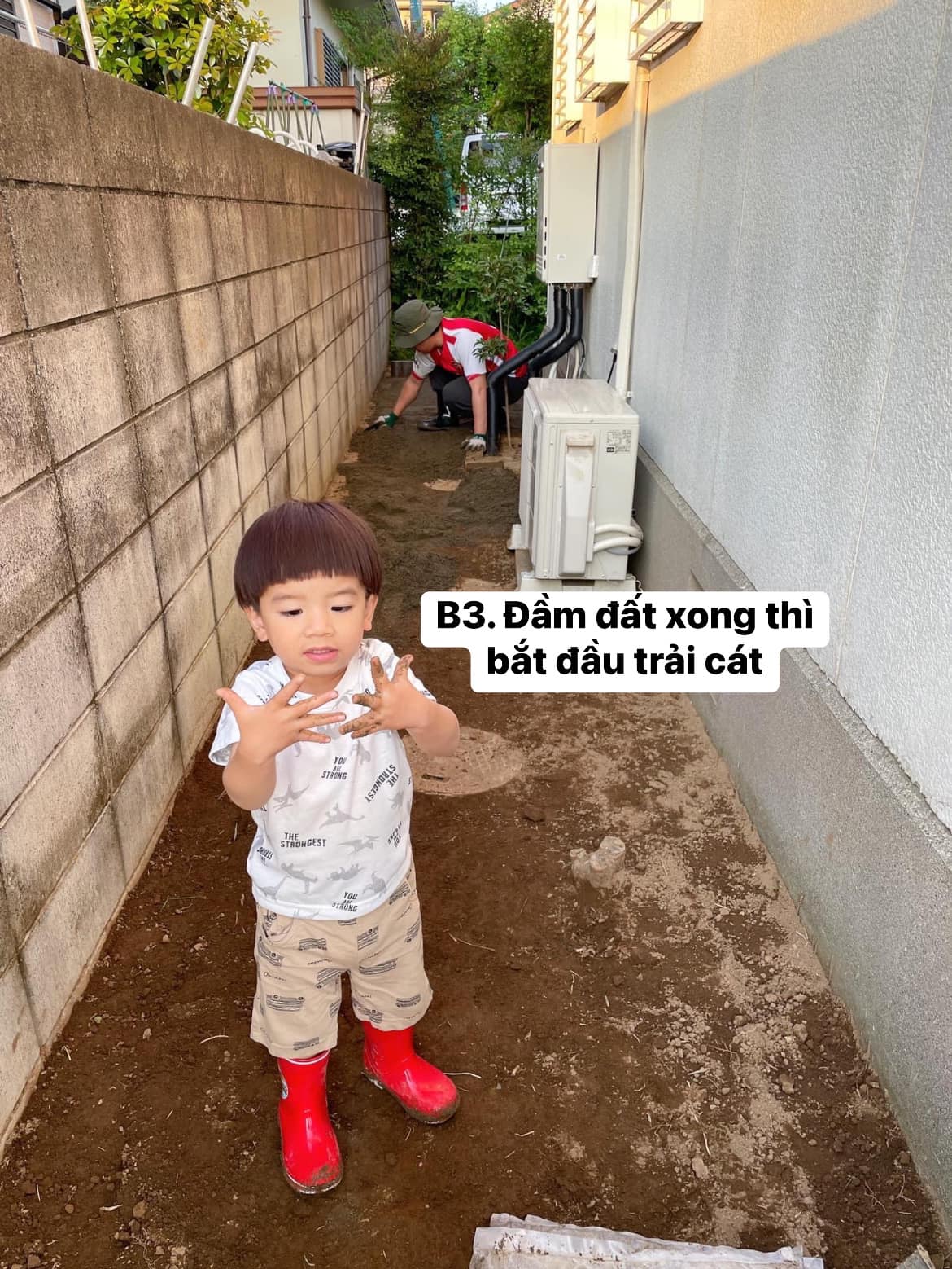 - Nếu trải cát thì cần thêm dụng cụ để cào phẳng cát ấy, nhưng nhà mình không mua, tận dụng tấm gỗ sẵn để cào phẳng cát, nhưng mỏi tay lắm.