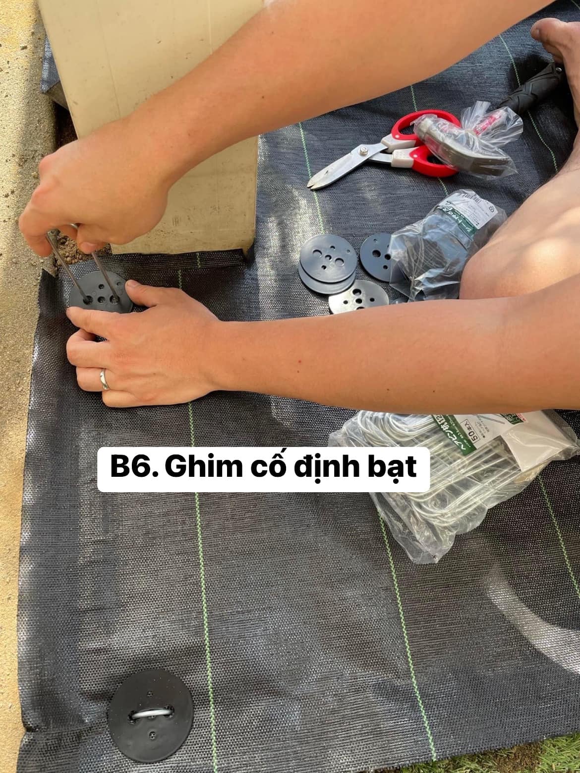 - Dùng ghim và miếng nhựa lót ghim để cố định bạt, dùng búa 🔨 gõ cho cái ghim 📍 ghim sâu xuống hết nhé.