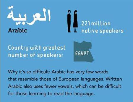 Tiếng Ảrập (Arabic) là một trong bốn thứ tiếng khó học nhất. Nguyên nhân là thứ tiếng này rất ít nguyên âm, khiến người nói tiếng Anh cảm thấy khó khăn.