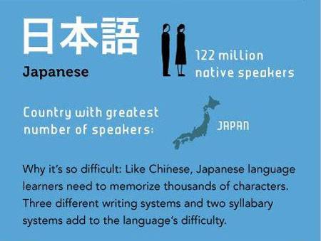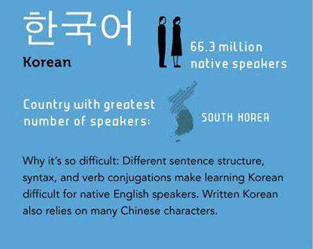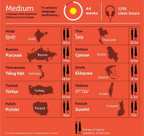 Với bốn thứ tiếng Ảrâp, Trung Quốc, Hàn Quốc, Nhật Bản, tính trung bình người học sẽ mất tới 1,69 năm (88 tuần) và 2.200 giờ học để trở nên thành thạo.