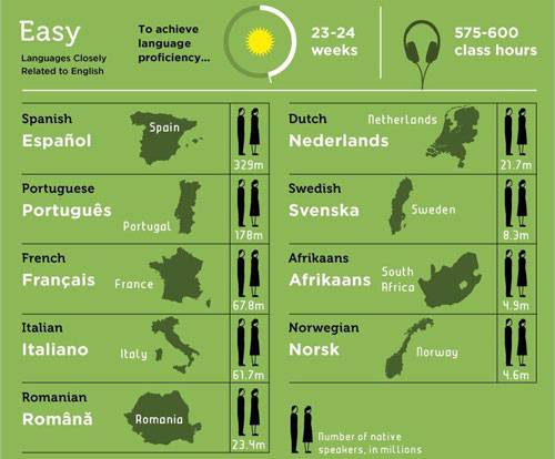 Theo đó, tiếng Tây Ban Nha, tiếng Pháp, Bồ Đào Nha, Italy được xem là dễ nhất, chỉ mất 23 đến 24 tuần học và 575 đến 600 giờ học để đạt đến mức độ thành thạo.